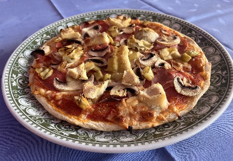Pizza Vegetaria mit Champignons, Spinat, Paprika, Artischocken und Zwiebeln